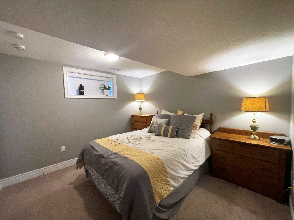The basement is a finished space for entertaining guests and includes two more bedrooms with queen beds in each. Plenty of comfortable sitting space, gas fireplace and large tv, dry bar area and treadmill for exercise. This separate living space also has a desk for remote working and a full bathroom for your guests or kids.